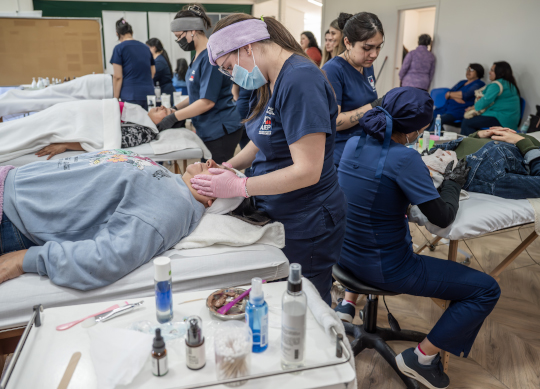 “Hoy participaron 24 estudiantes de nuestra escuela, de las carreras de Estética Profesional y Técnico de Cosmetología, quienes realizaron los servicios de limpieza facial y manicure en el cuidado de la piel. Además, contamos con técnicos en peluquería, quienes realizaron cuidado capilar y cortes de pelo, y cambios de look. Mientras que los técnicos en masoterapia realizaron actividades de reiki y masajes a las vecinas”, explica Juanita Mayorga, jefa de la Escuela de Estética Integral de Aiep Puerto Montt.